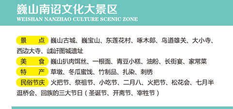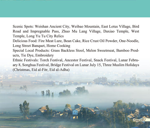 Weishan Nanzhao Culture Scenic Zone Scenic Spots: Weishan Ancient City, Weibao Mountain, East Lotus Village, Bird Road and Impregnable Pass, Zhuo Mu Lang Village, Daxiao Temple, West Temple, Long Yu Tu City Relics